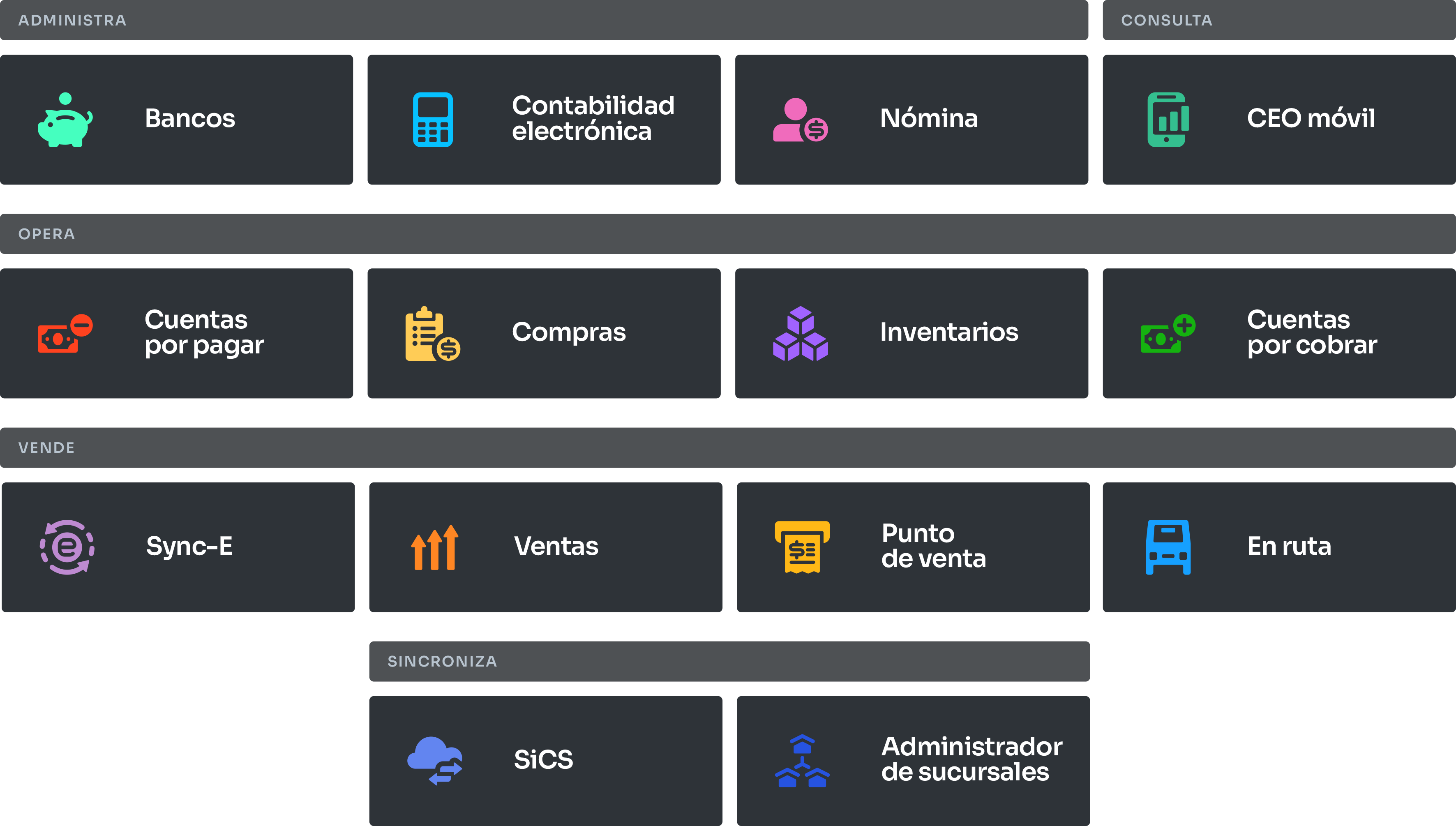 Es un completo ERP para PYME's con mas de 25 años de experiencia en el mercado y que se encuentra conformado por trece módulos los cuales pueden funcionar en forma individual o integral, dependiendo de las necesidades de su negocio y permiten llevar controles precisos y eficientes de manera fácil y accesible en todo momento.